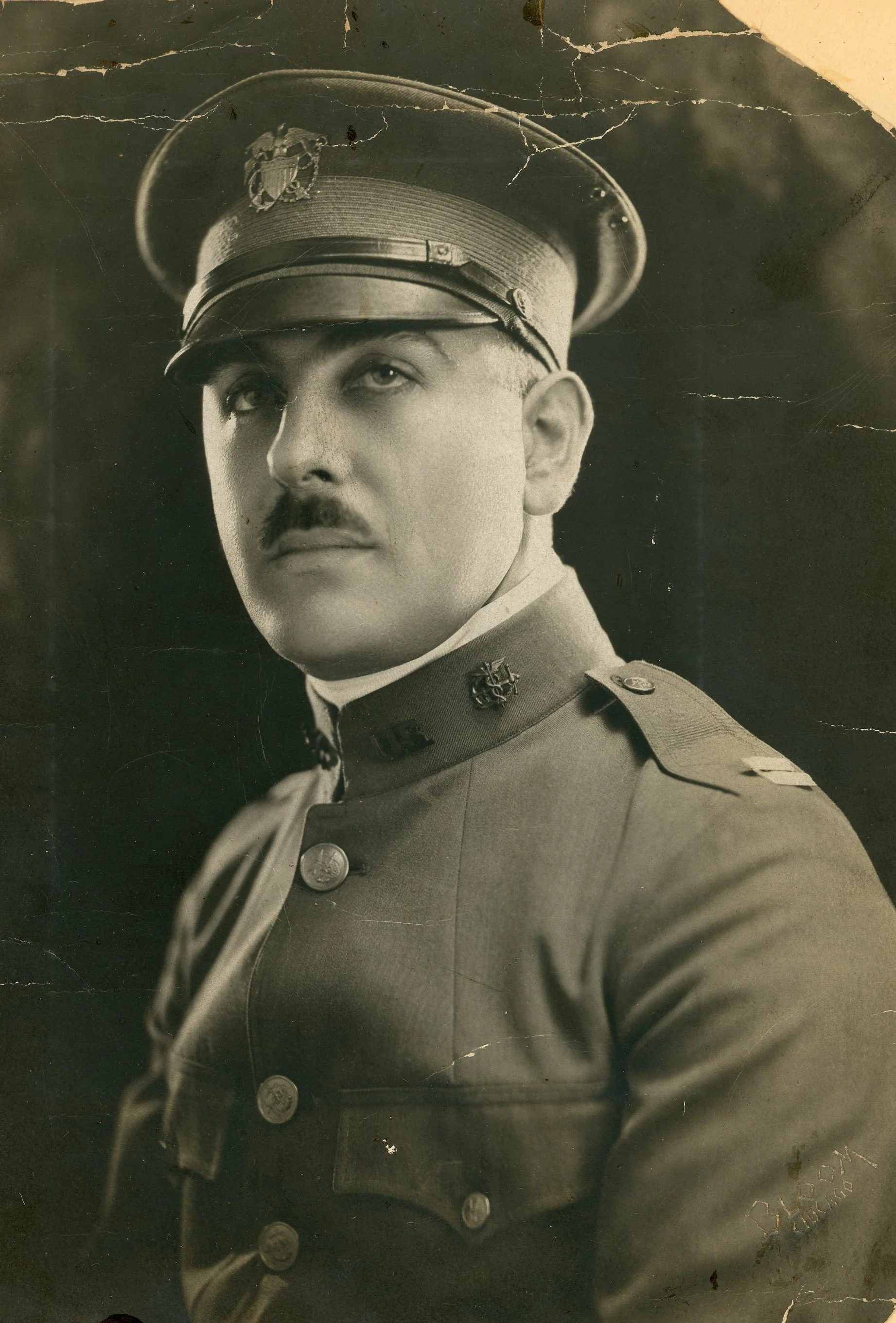 Sepia-toned portrait of a young Army officer in uniform after World War I, his duty still inscribed in brass buttons and cloth.